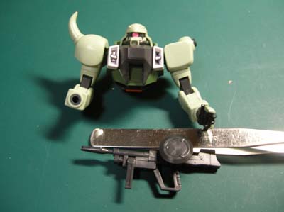 1/144 HG GUNNER ZAKU WARRIOR 2007/02/26-27 実はこの子は写真があまりありません。 しかもガナーウィザードがまだ未完成です。 製作1日目。ライフルと上半身です。 製作2日目。同時進行でスラッシュウィザードを造っていたのでスラッシュウィザードを背負わせてみました。 スラッシュウィザード完成型です。 かなり誤魔化していますが。